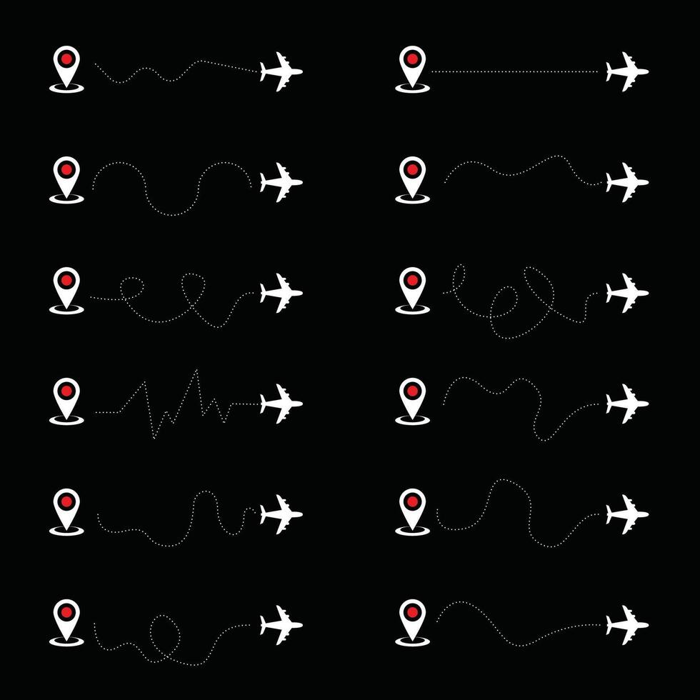 Airplane dotted route line set. Path travel line shapes. Flight route with start point and dash line trace for plane illustration Pro Vector