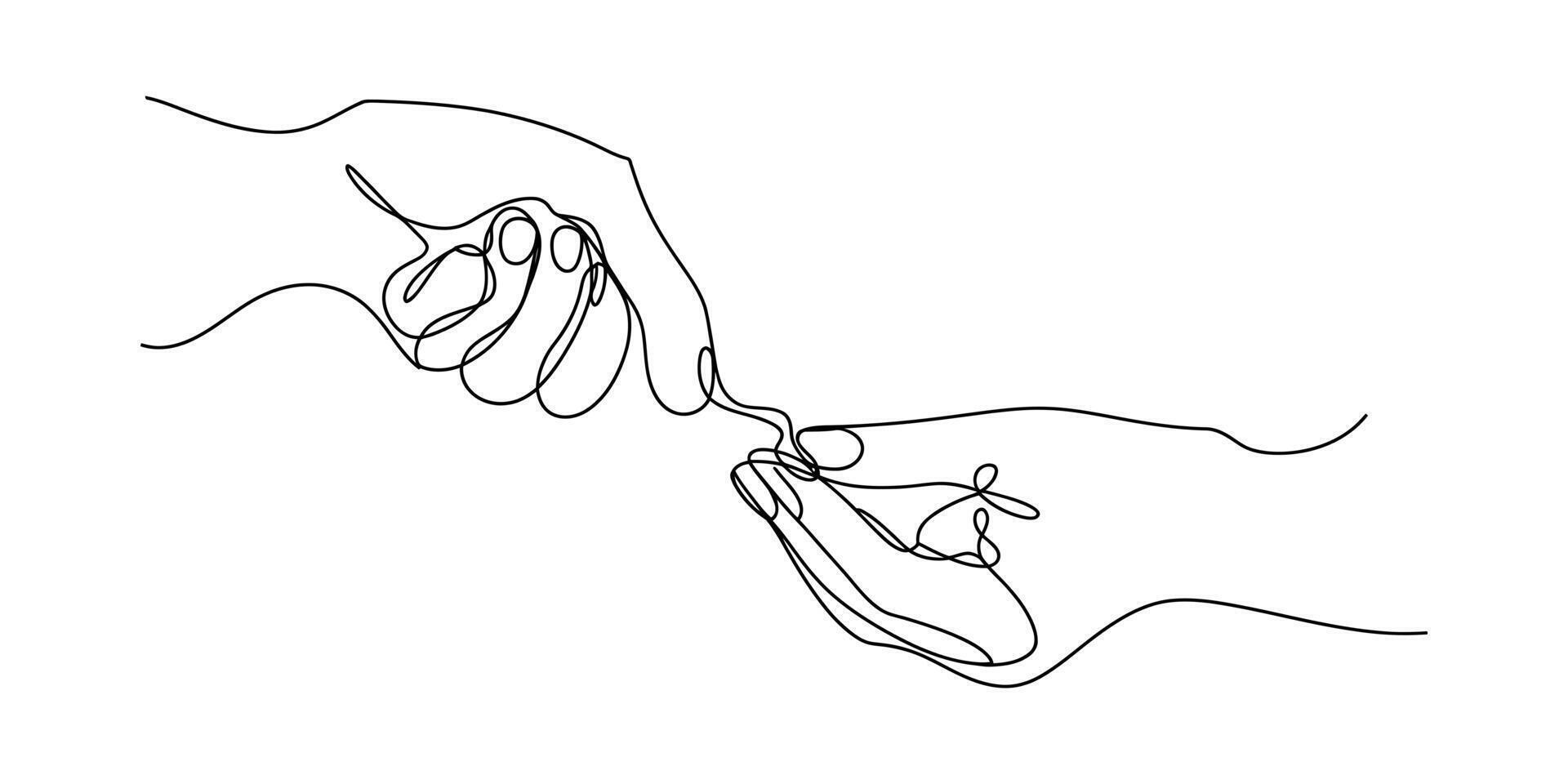Minimalist single line drawing of two hands interacting with a thread illustration Pro Vector