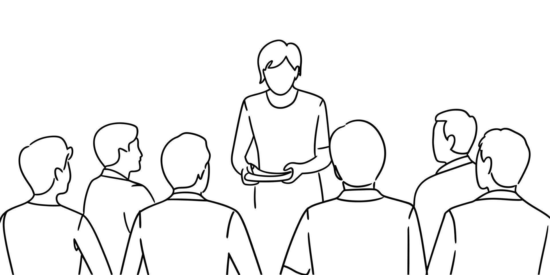Continuous line drawing of a speaker addressing an audience in a simplistic sketch style Illustration Pro Vector