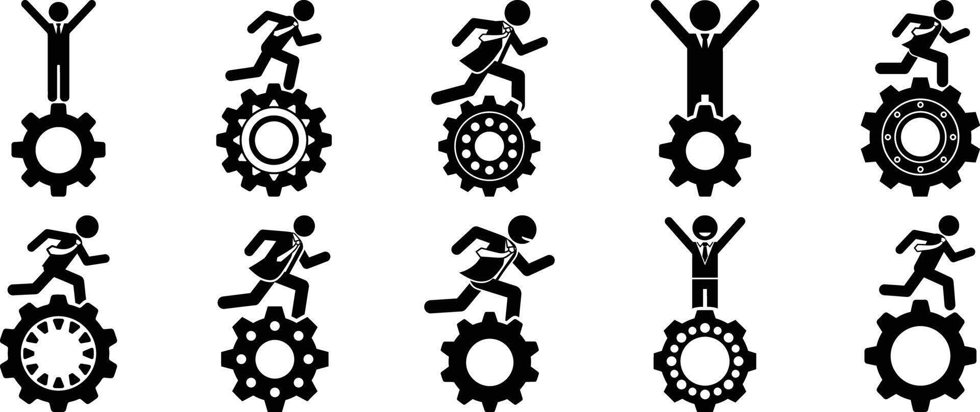 A collection of stick figures interacting with gears, symbolizing business progress and mechanical effort Pro Vector