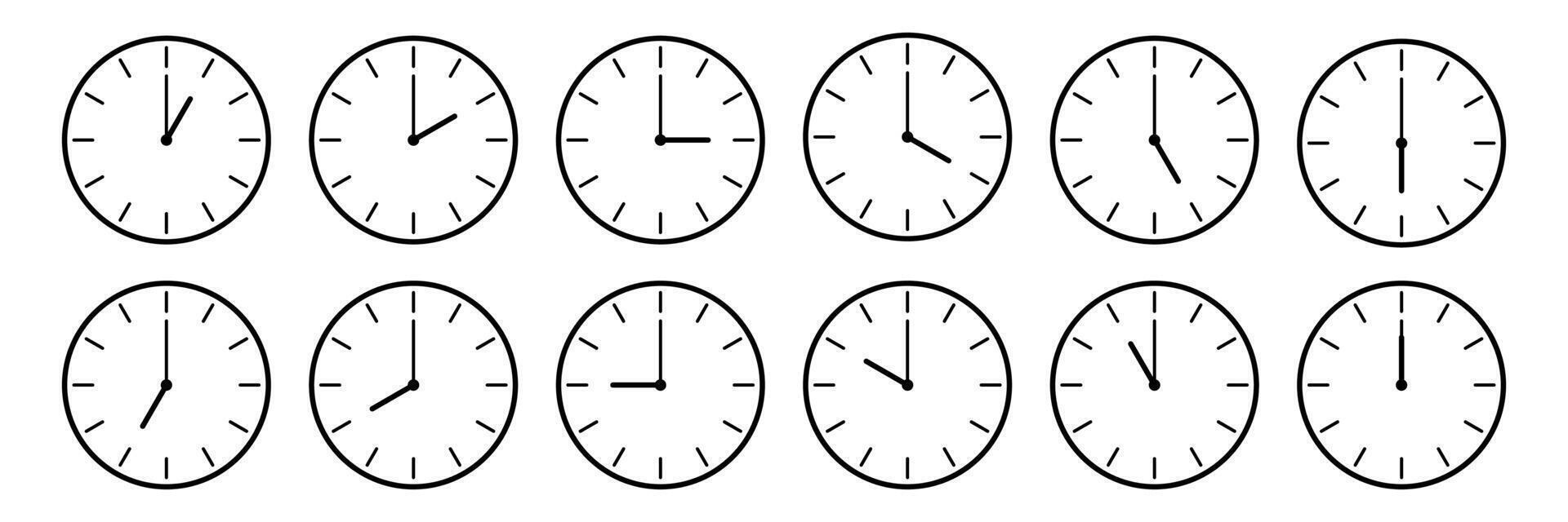 horizontal set of analog clock icon notifying each hour isolated on white, illustration. Pro Vector
