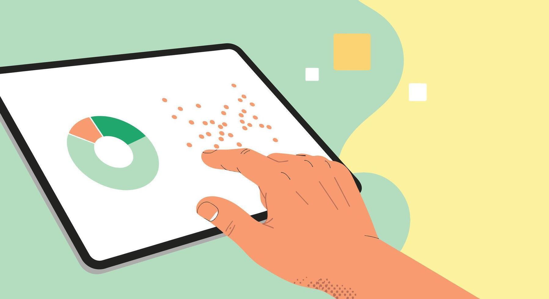 Hand interacting with a tablet displaying a pie chart and scatter plot, representing data analysis and digital interaction Pro Vector