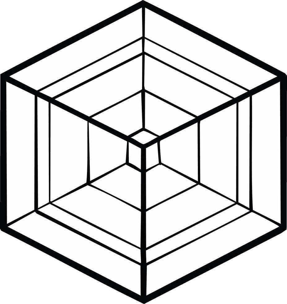 Abstract geometric wireframe of a cube creating an optical illusion of depth. Isometric hexagon line art illustration. Pro Vector