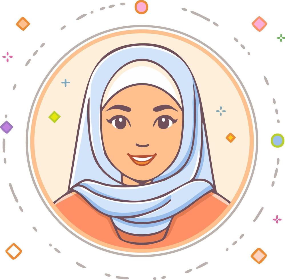 Smiling Woman Wearing Hijab Surrounded by Decorative Elements in Circular Frame Pro Vector