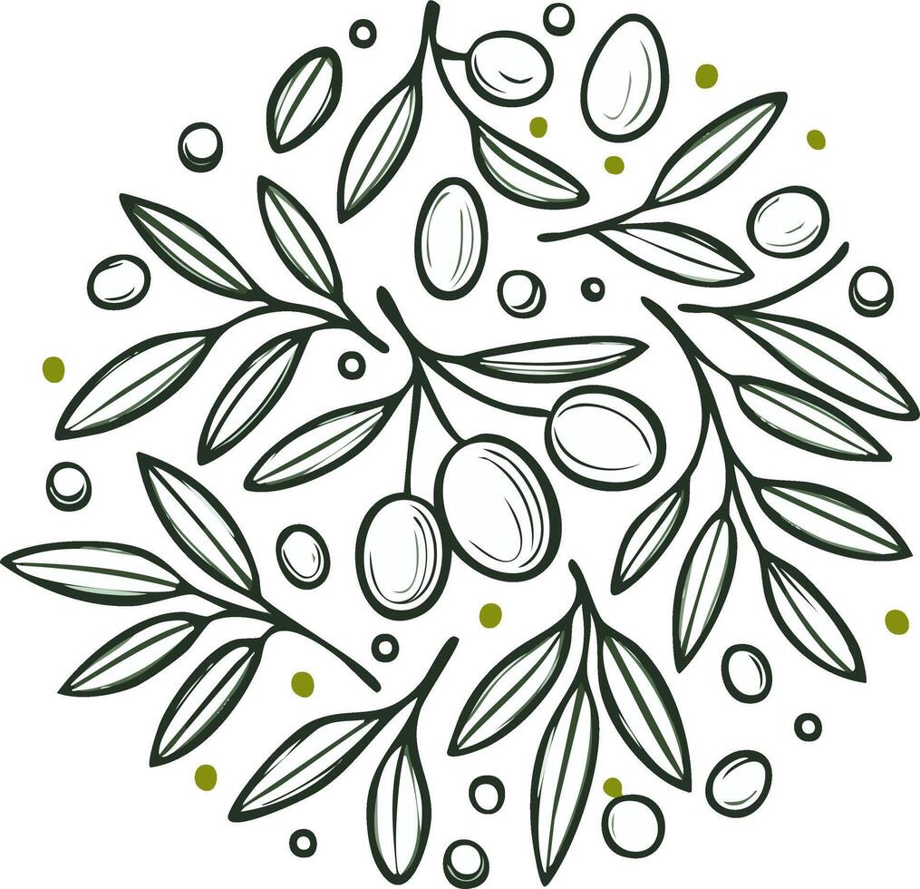 Circular pattern of olive branches with leaves and fruits, hand-drawn sketch style Pro Vector