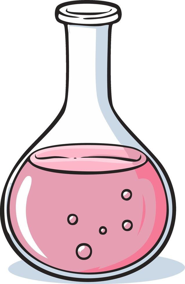 Cartoon science laboratory flask with pink liquid and bubbles for experiment Pro Vector