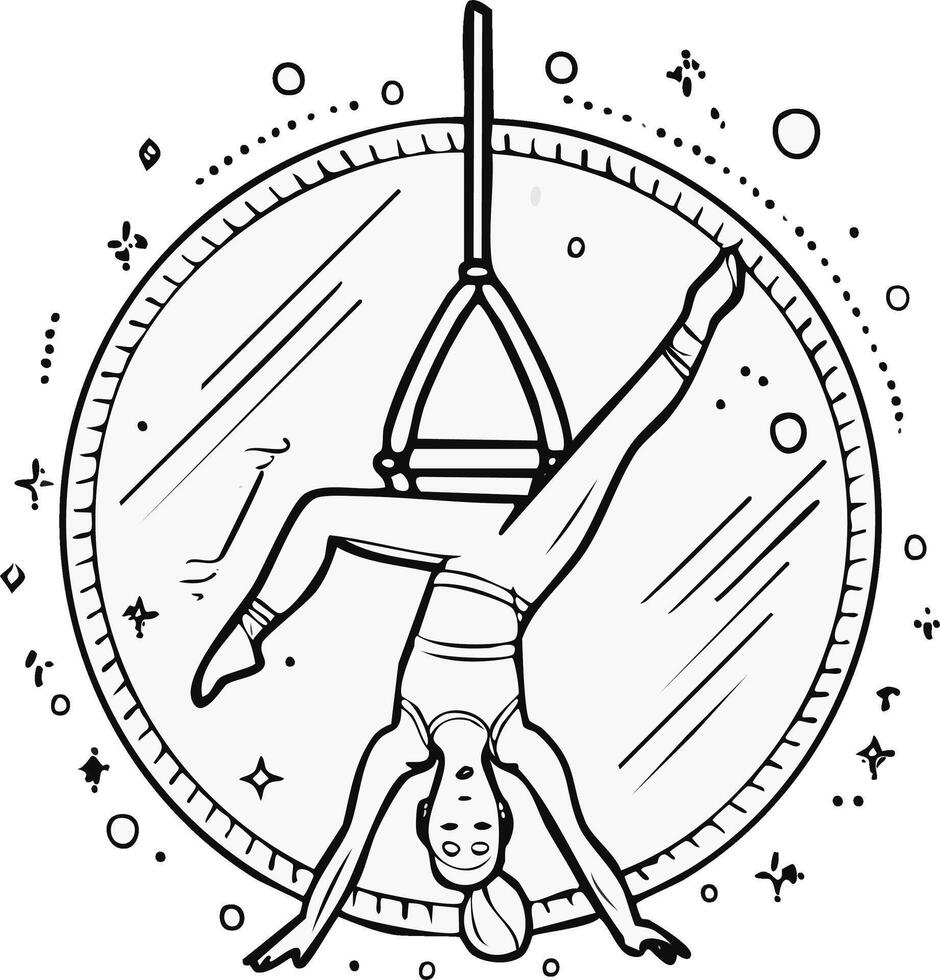 Line art of a flexible female acrobat on a trapeze within a sparkling circular frame Pro Vector