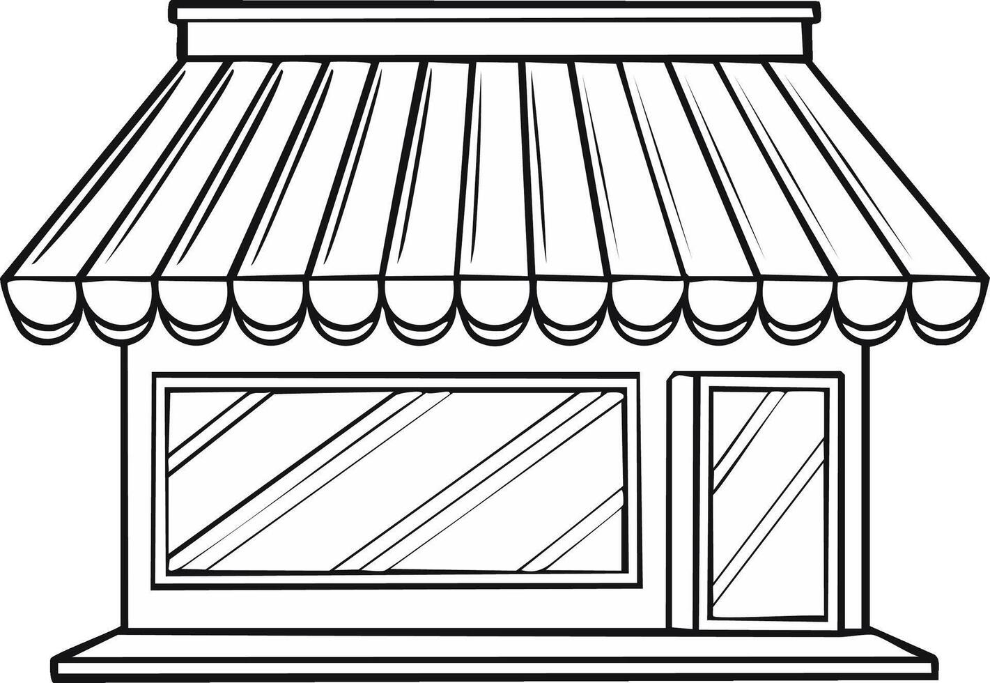 Simple black and white drawing of a storefront with a striped awning and large windows Pro Vector