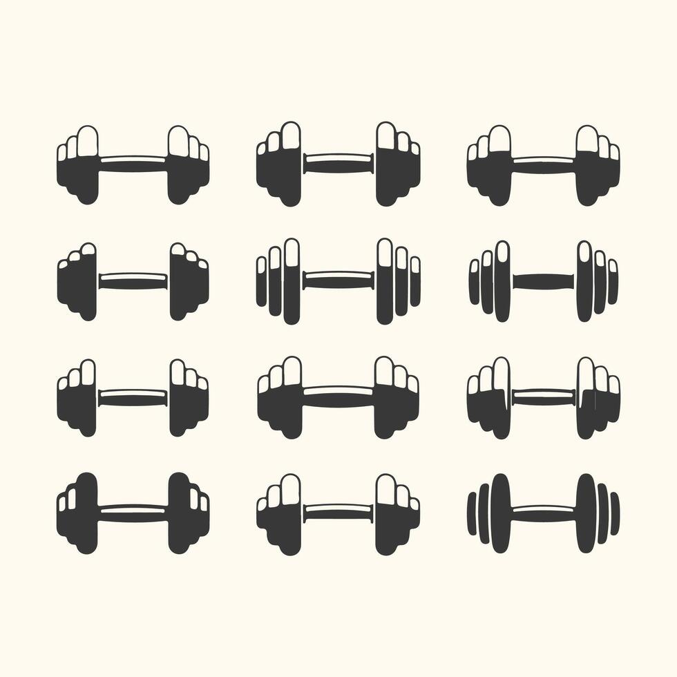Art of a collection of twelve black dumbbells arranged in a grid pattern on a light cream background, symbolizing fitness and strength training vector