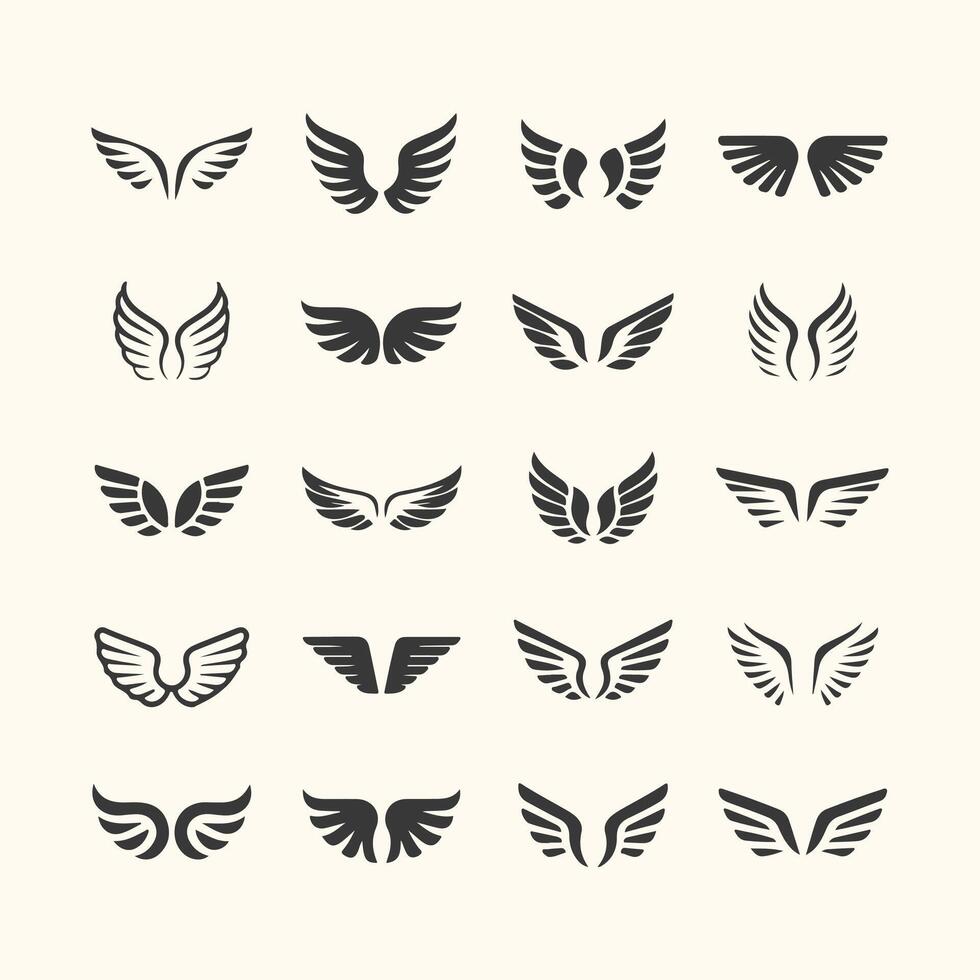 Art of a collection of diverse wing icons, isolated on a, showcasing various styles from simple outlines to detailed feather designs, perfect for emblems Pro Vector