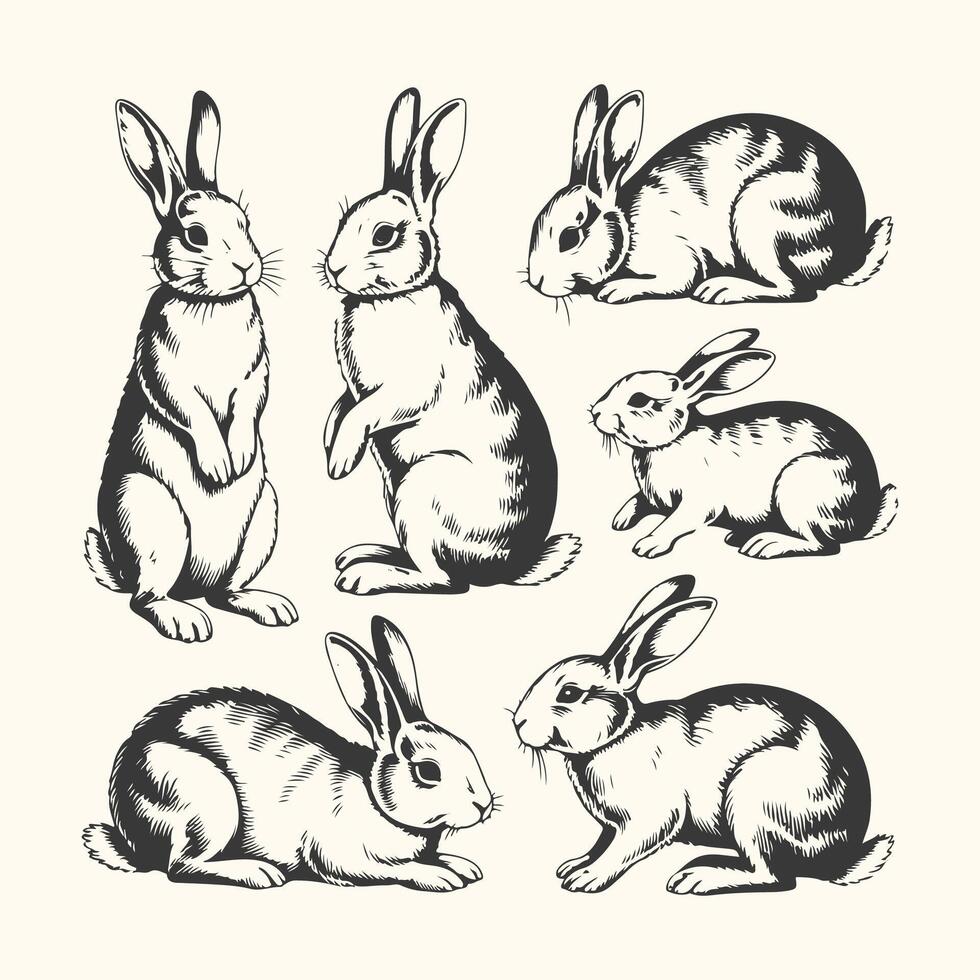 Art of a charming collection of six handdrawn rabbits in various poses, showcasing their unique personalities and forms, isolated on a plain background for versatile use vector