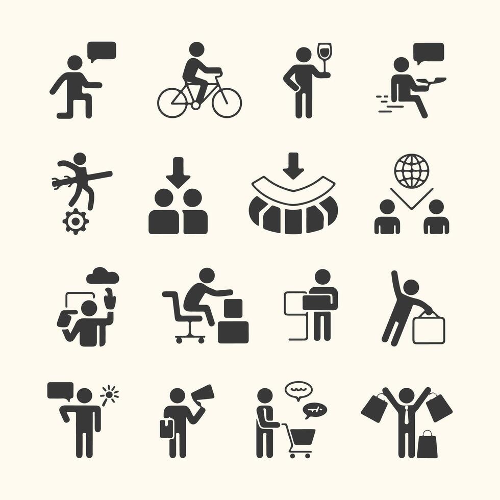 Art of collection of simple black pictograms representing various human activities and concepts, such as communication, cycling, shopping, and work, isolated on a light background vector