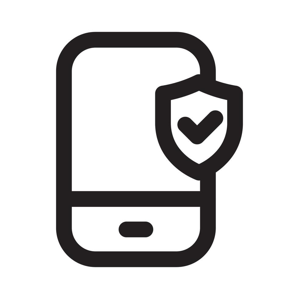 A line style icon of a shield with a mobile phone symbolizing mobile security or app protection. vector