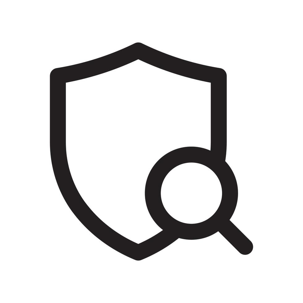 A line style icon of a shield with a magnifying glass symbolizing security audit or vulnerability search. vector
