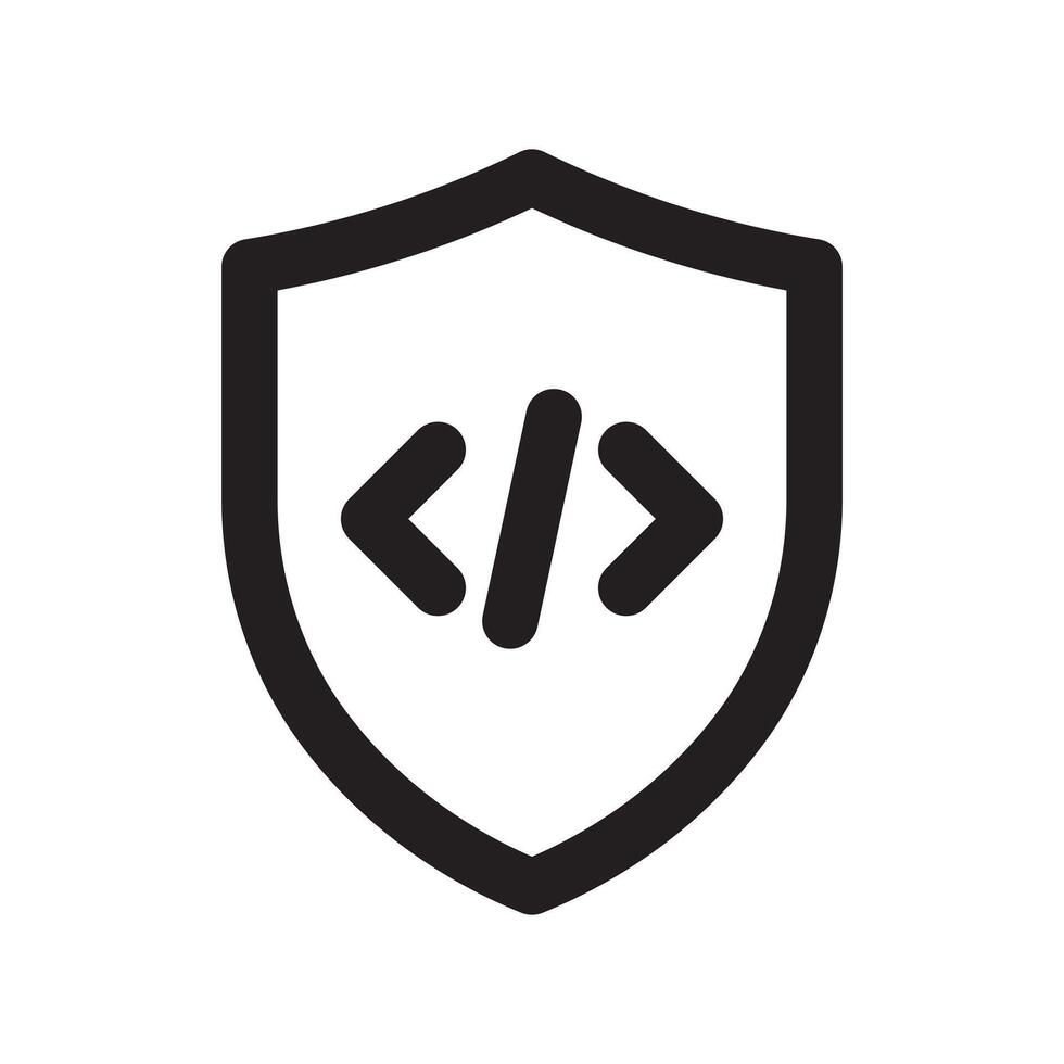 A line style icon of a shield with code symbols symbolizing source code security or software protection. vector