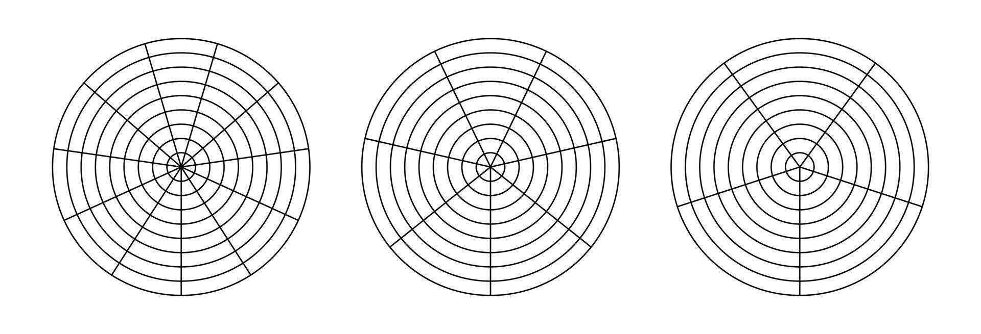 Polar grid with segments, concentric circles. Wheel of life. Coaching tool simple for visualizing all areas of life. Circle diagram of life style balance. Black blank of graph paper. Pro Vector