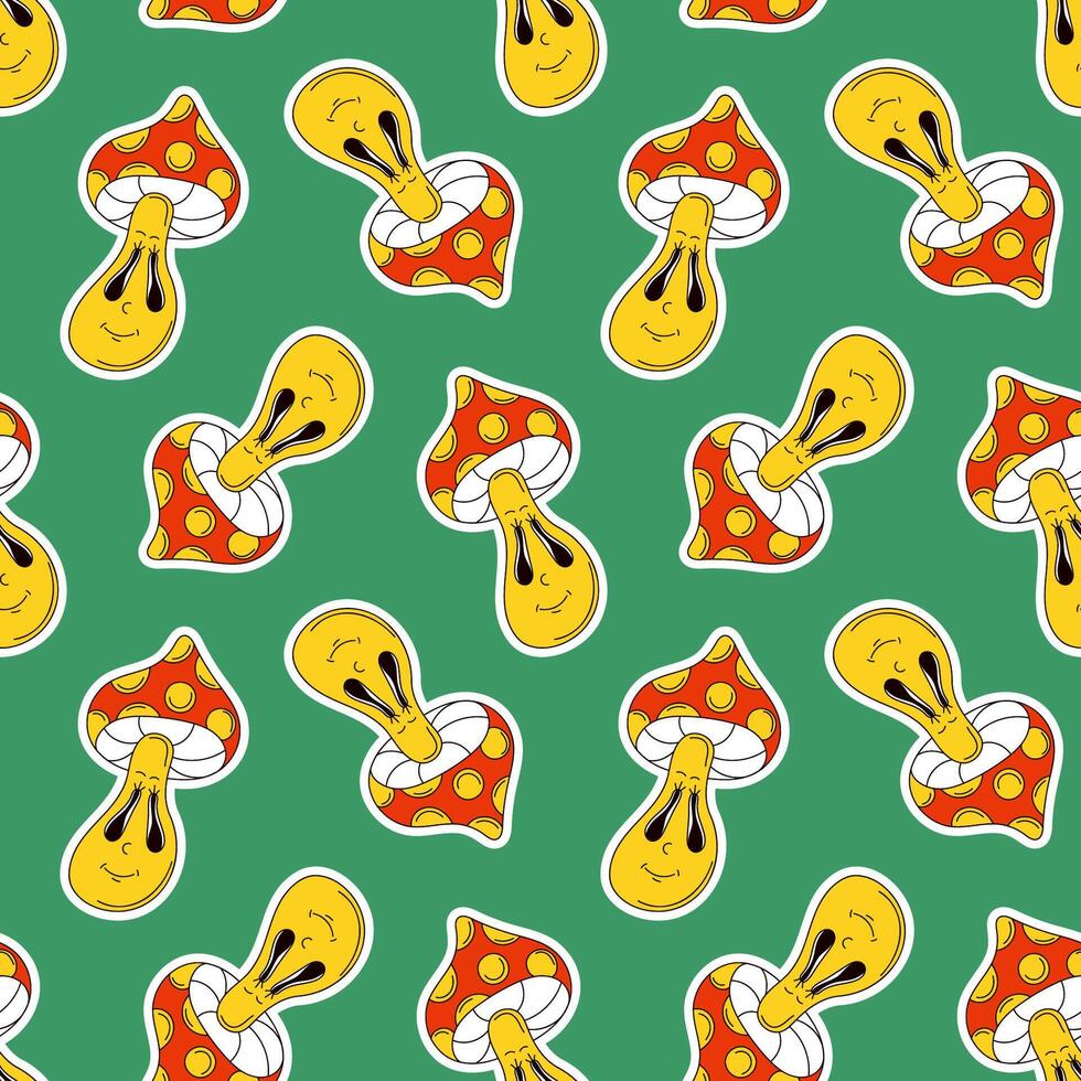Seamless pattern of groovy cartoon style mushroom with smiling face on green background. Playful and whimsical design for cloth. Pro Vector