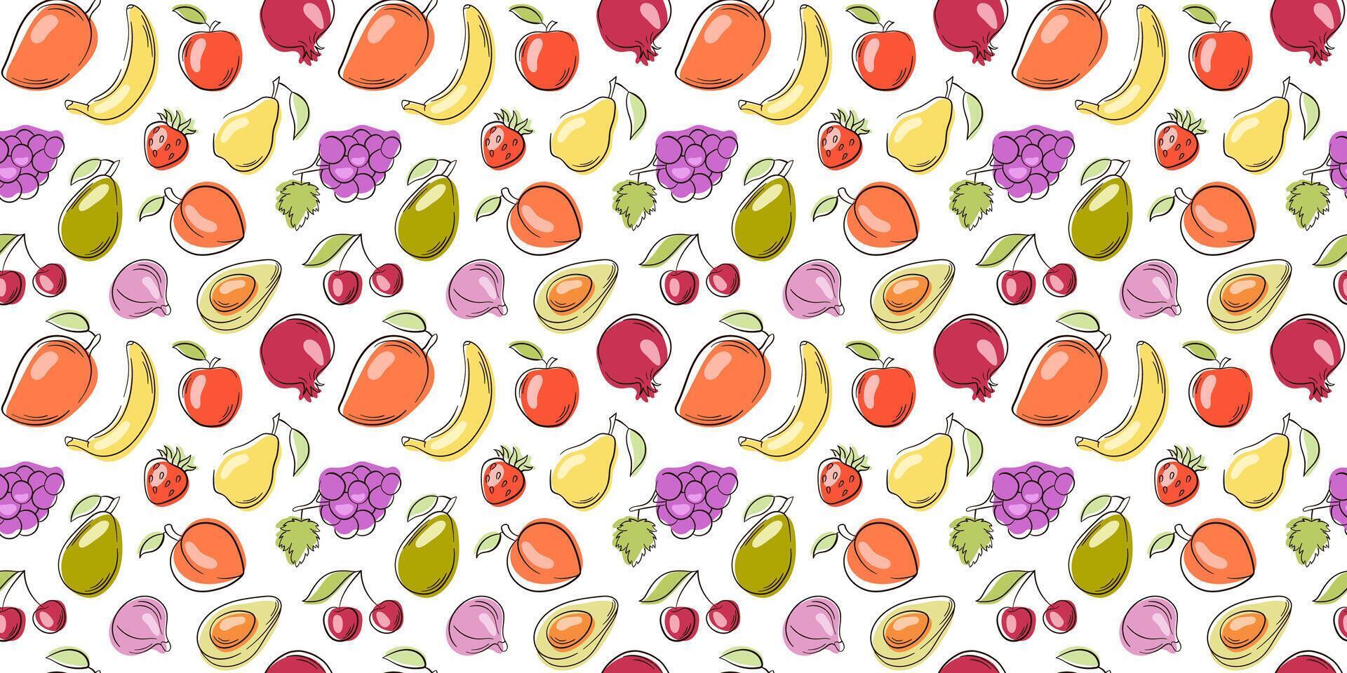 Seamless pattern with flat style fruit, mango, banana, apple, pomegranate, strawberry, pear, grape, avocado and cherry on white background. Design for grocery store package. Pro Vector