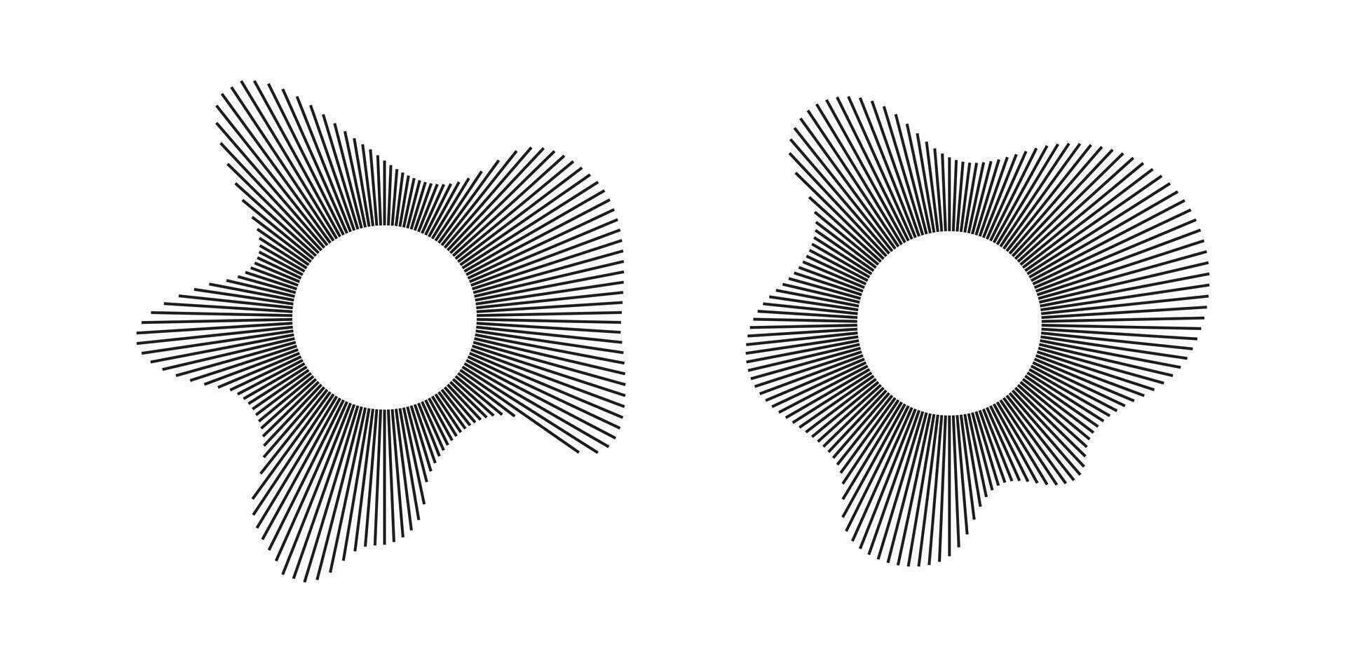 Equalizer logo, radial spectrum. Voice symbols. Depicting audio music icons. Circular waves. Sound circle lines. Radial frame set. Sound rings. Wavy frame patterns. Radial rays. Wavy design elements. Pro Vector