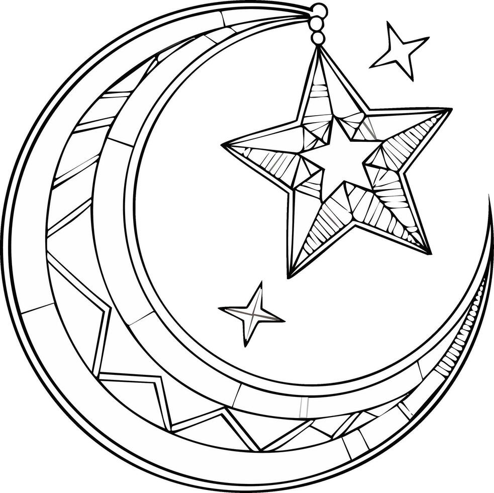 Stylized Crescent Moon with Stars and Geometric Patterns Outline Pro Vector