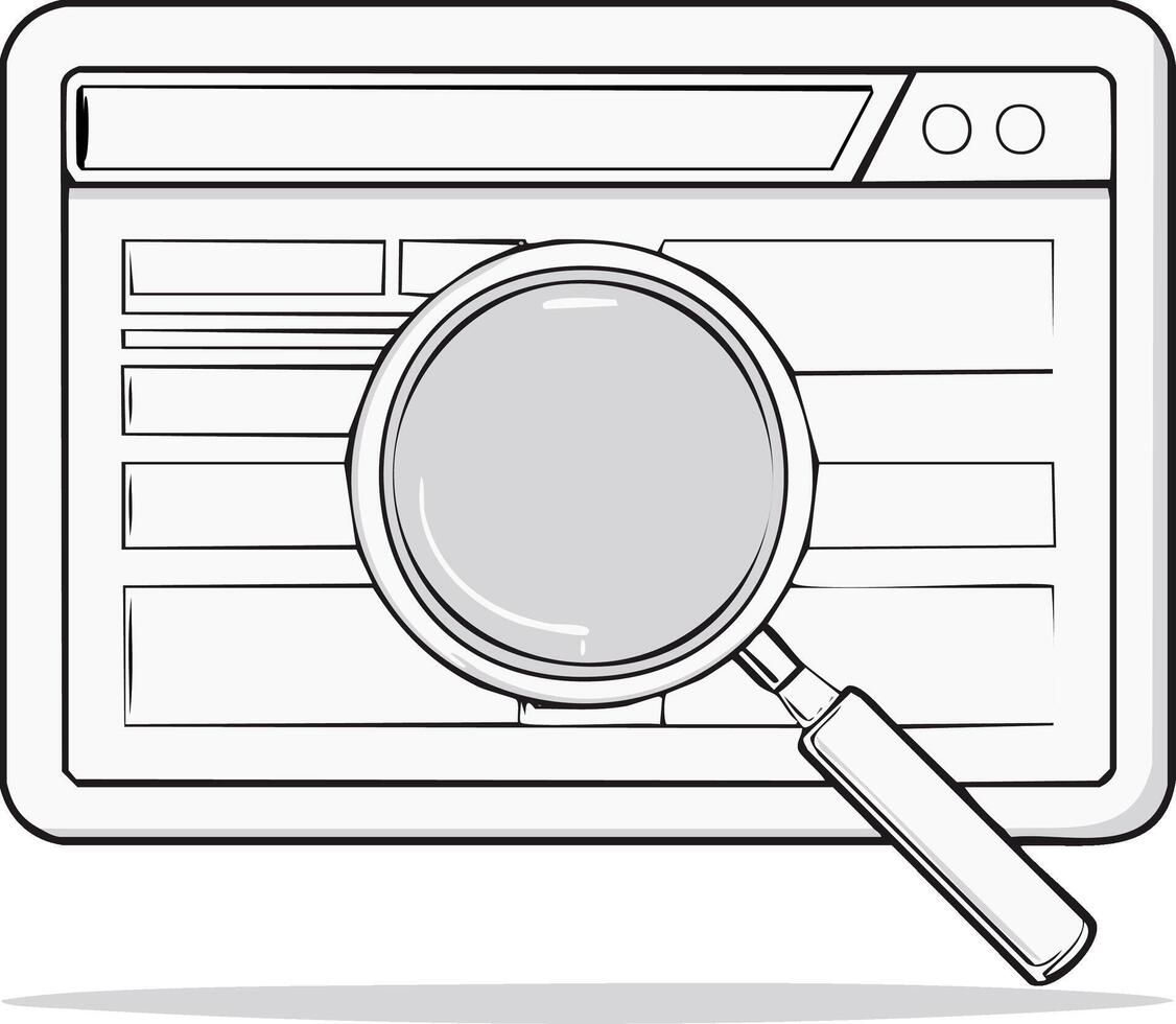 Magnifying glass over web browser window, depicting online search, data analysis, and information finding line art Pro Vector