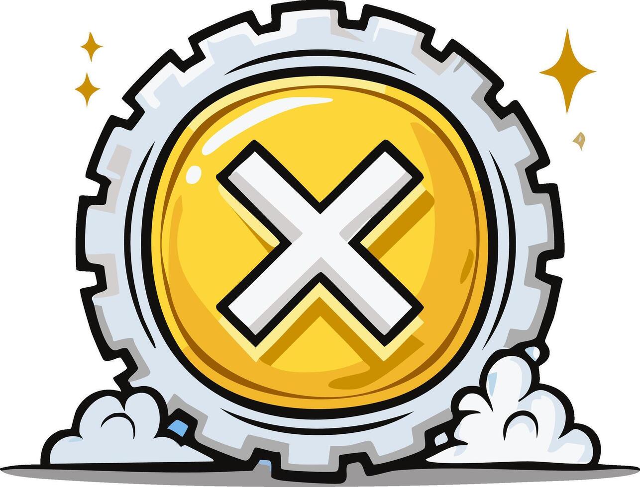 Bright cartoon gear with large X mark error symbol creating motion dust and sparkles Pro Vector