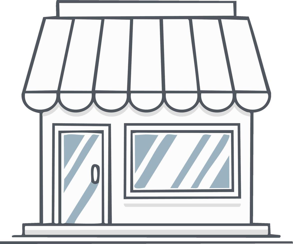 Simple sketch of a small store with awning, door, and display window, isolated Pro Vector