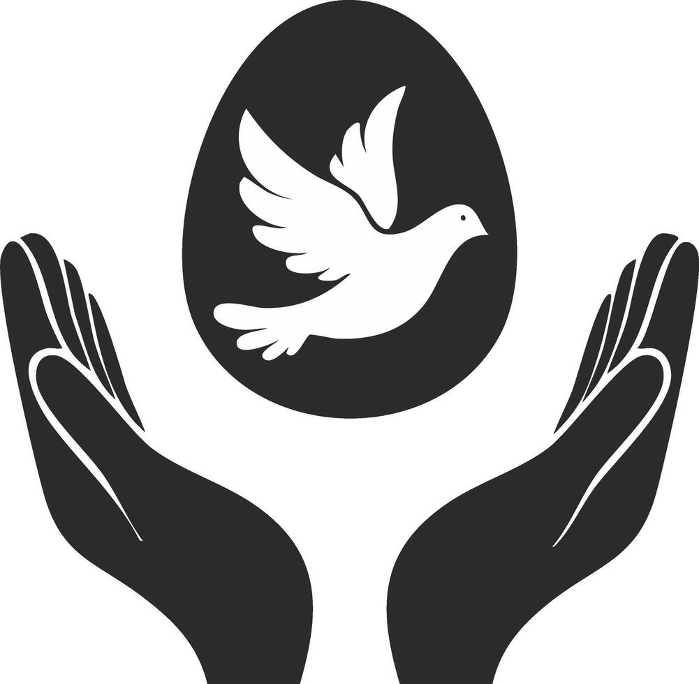Two open hands hold a dark egg with a white dove flying inside representing hope and new beginnings Pro Vector
