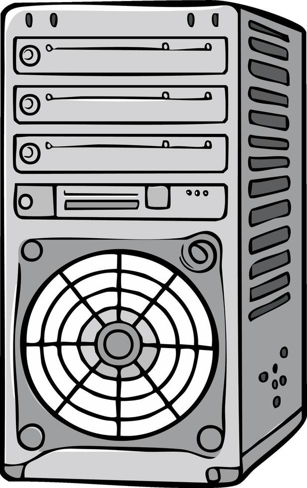 Drawing of a computer tower with a large front fan and several drive bays Pro Vector