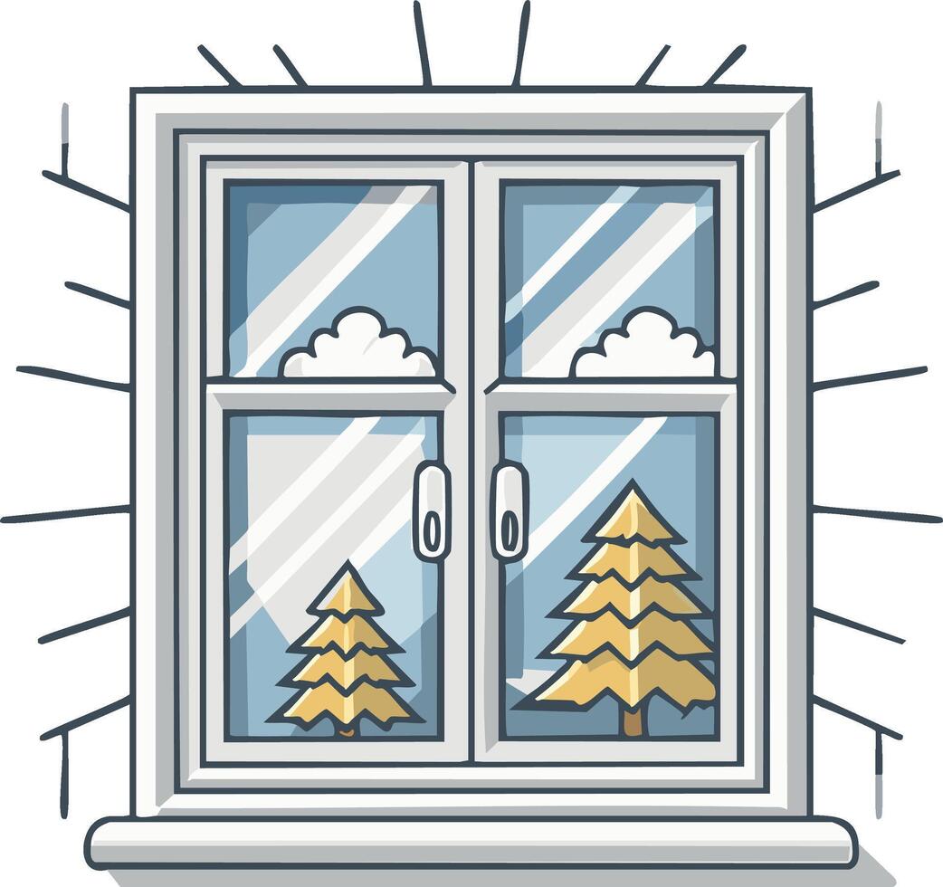 Cartoon winter scene viewed through a window with two evergreen trees and clouds Pro Vector