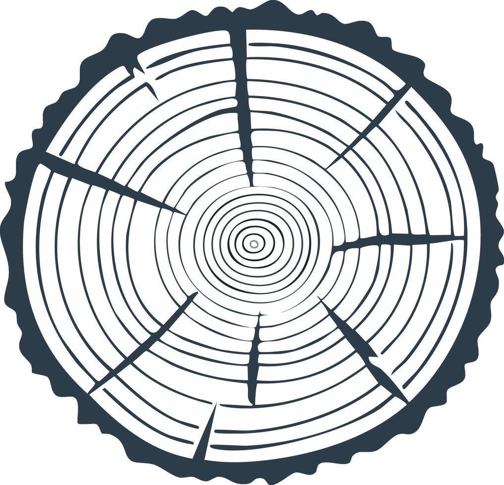 Cross section of tree trunk showing growth rings and bark texture in monochrome silhouette Pro Vector