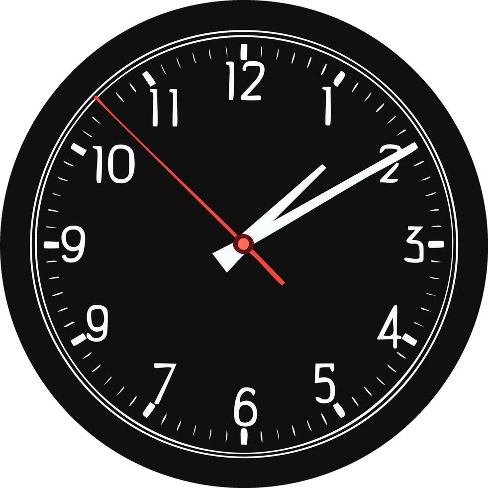 Black analog clock face with white numerals and hands, illustrating time, minute and hour display with a red second hand movement Pro Vector