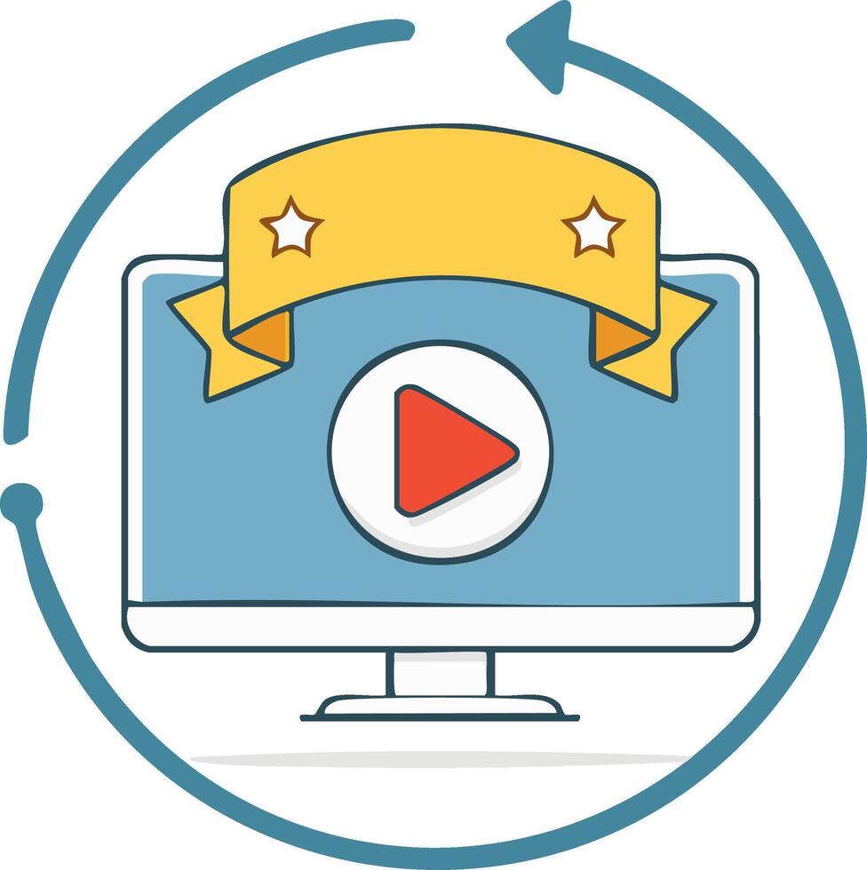 Computer screen displays play button on blue display with yellow banner and circling arrows Pro Vector