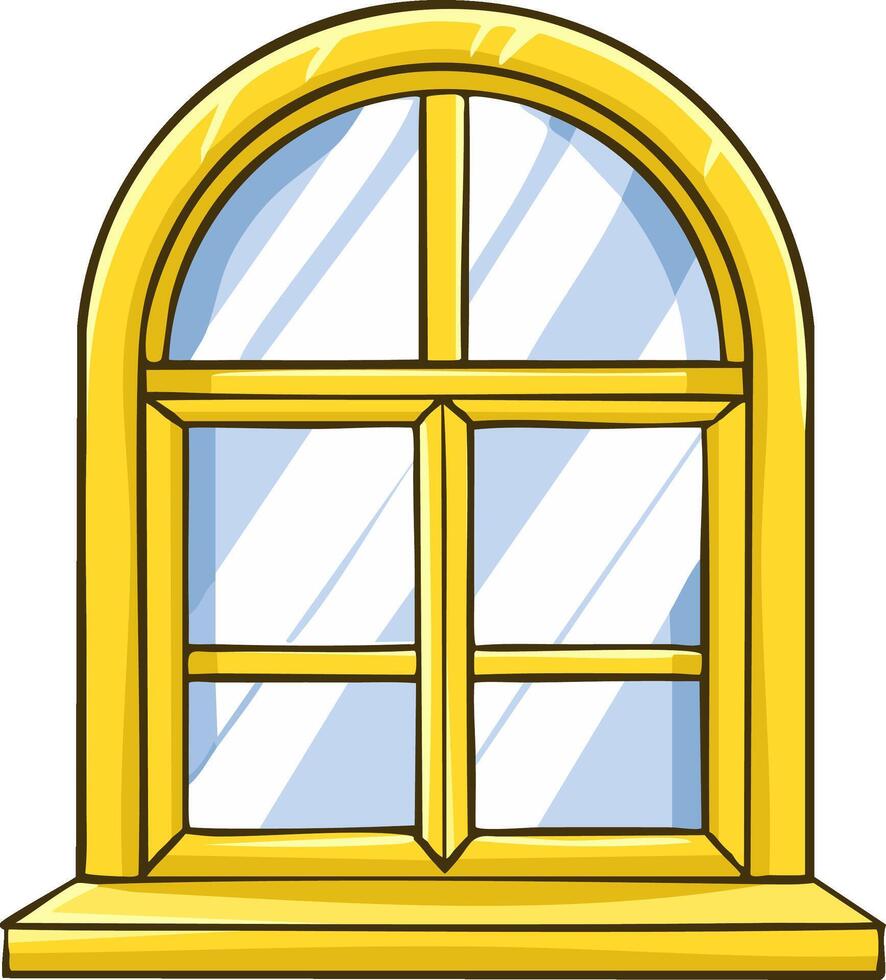 Cartoon illustration of a yellow arched window with a view, cheerful architecture design Pro Vector