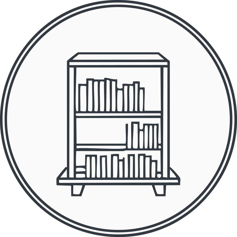Minimalist line art icon of a bookshelf filled with books within a double circle border Pro Vector