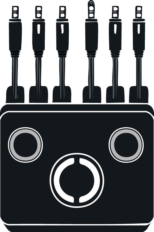 Stylized black sound mixing board with jacks, buttons, and a stylized design for audio control Pro Vector