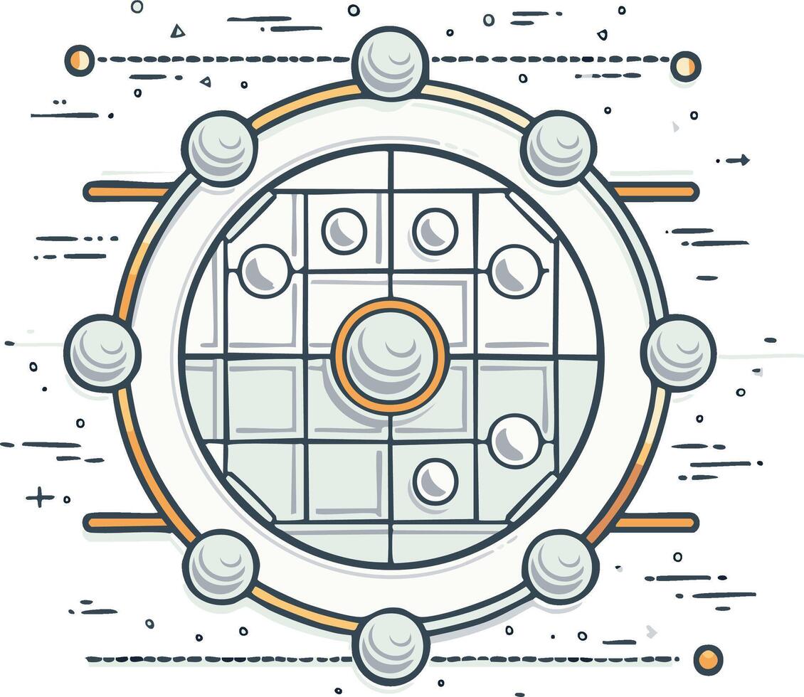 Abstract circular diagram with interconnected spheres and geometric grid Pro Vector