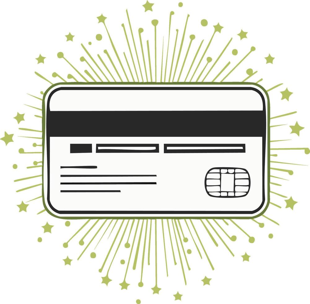 Stylized payment card with chip and magnetic stripe surrounded by a dynamic green starburst and dots Pro Vector