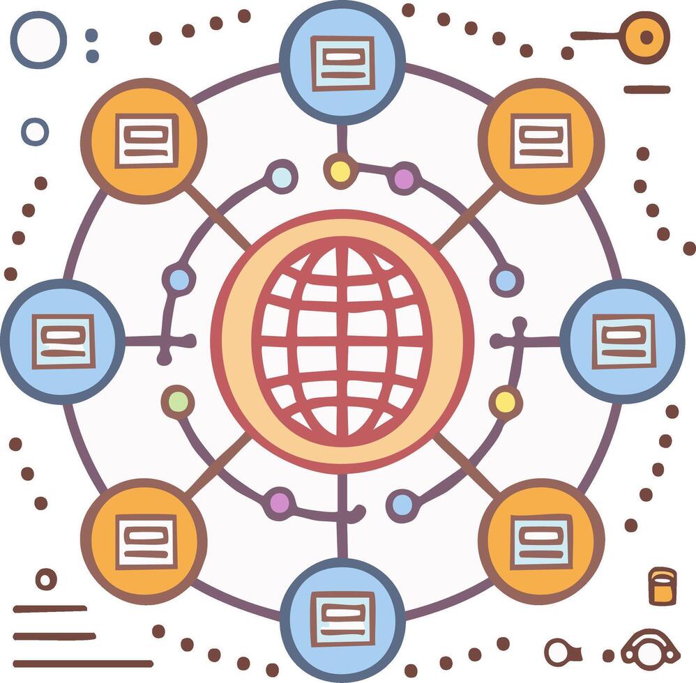 Connected global network with document page icons in a circle, abstract worldwide business system Pro Vector