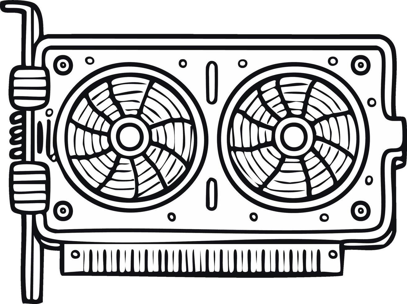 Stylized line drawing of a dual fan computer graphics card with cooling vents and heatsink fins Pro Vector