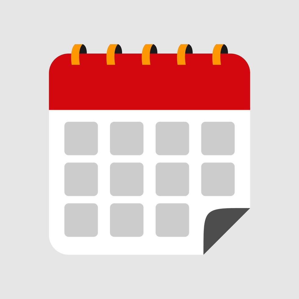 Flat design calendar icon with red top, gray cells, and a turned-up corner Pro Vector