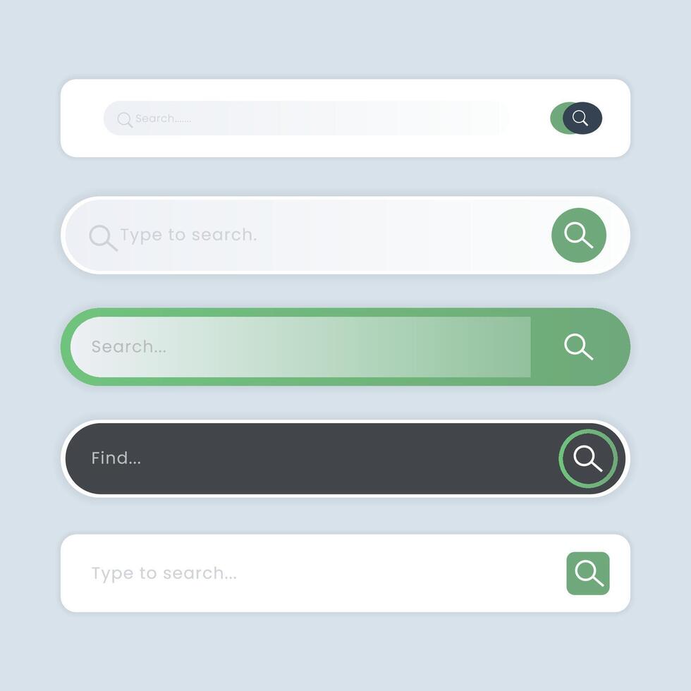 Set of search box input fields with magnifying glass icons. Modern flat UX UI design kit for web or mobile application interface. Pro Vector
