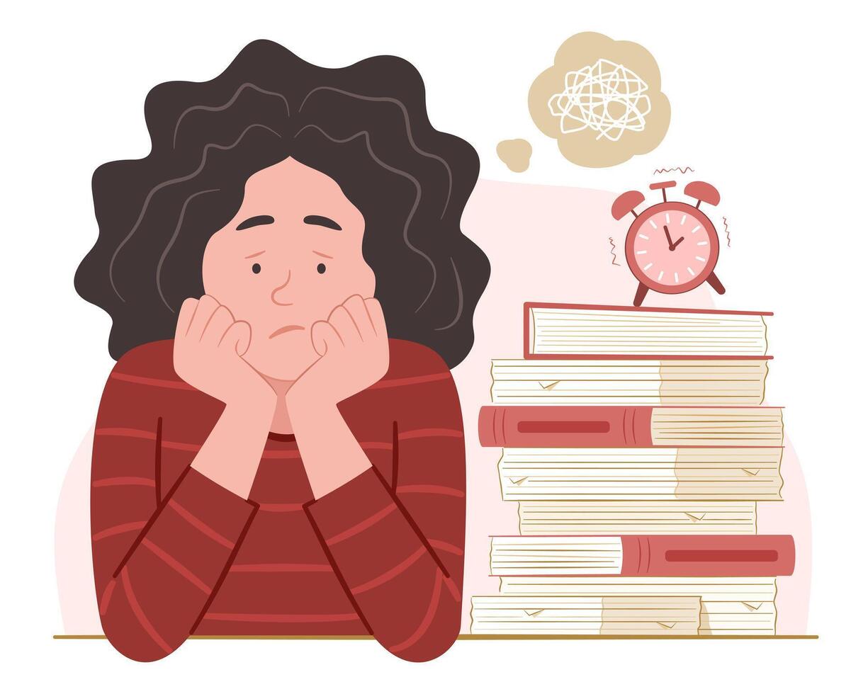 Freelancer Woman Burnout and Confused with Stack of Lot of Document Files for Overload Working and Overburdened Concept Illustration Pro Vector