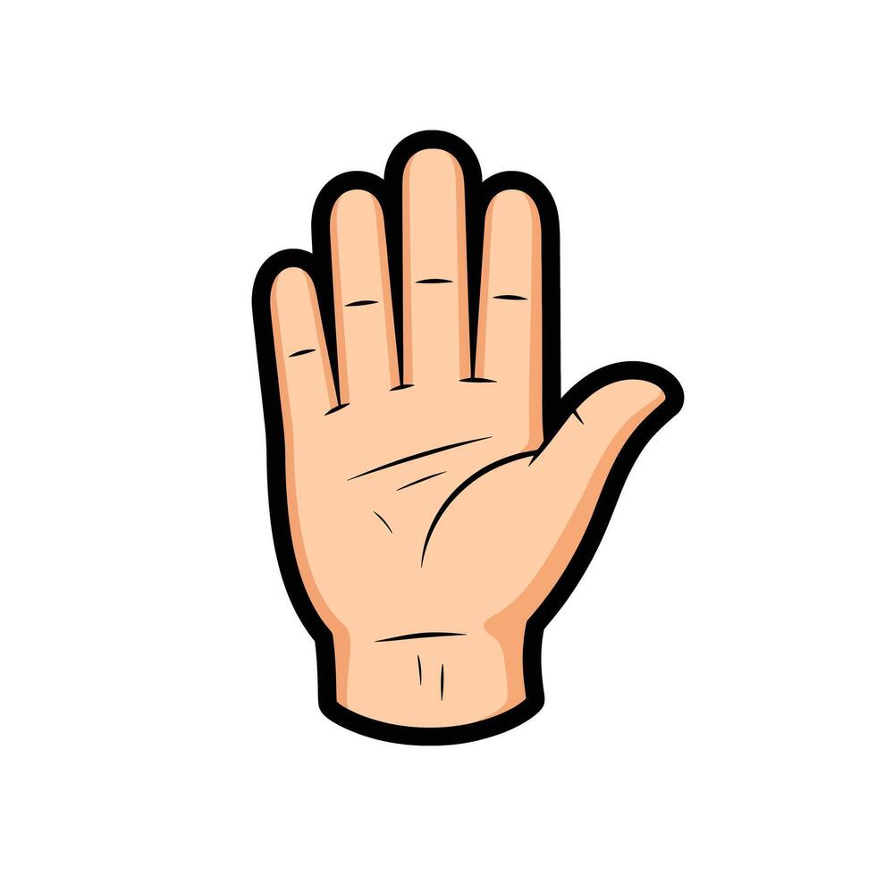 A bold and clear cartoon illustration of an open human hand with the palm facing forward, perfect for conveying universal gestures like a stop sign, a friendly greeting, or a warning vector
