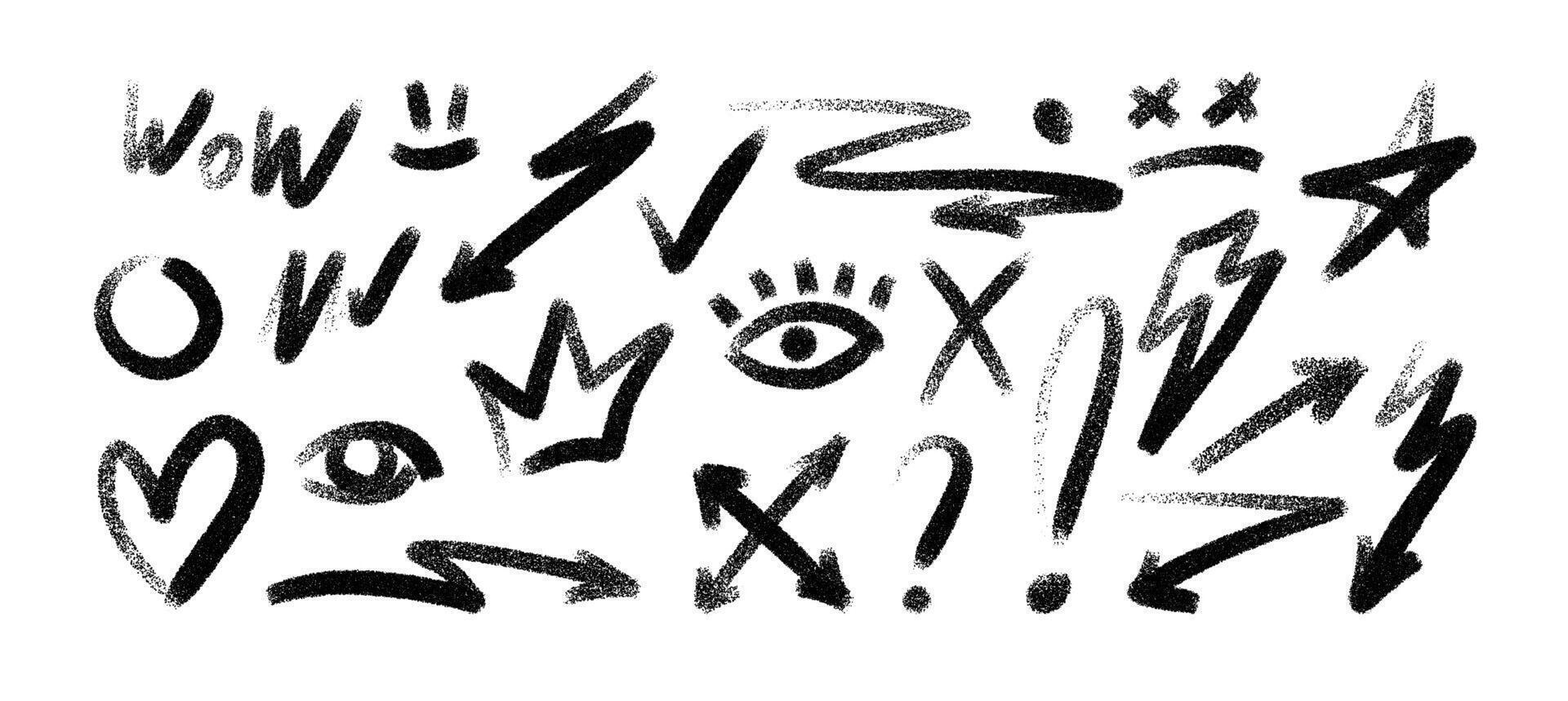 Abstract graphic elements with paint, marker, and crayon strokes form a playful street-style design. Scribbles, drips, and lightning icons bring energy, while texture and splatter add artistic chaos Pro Vector