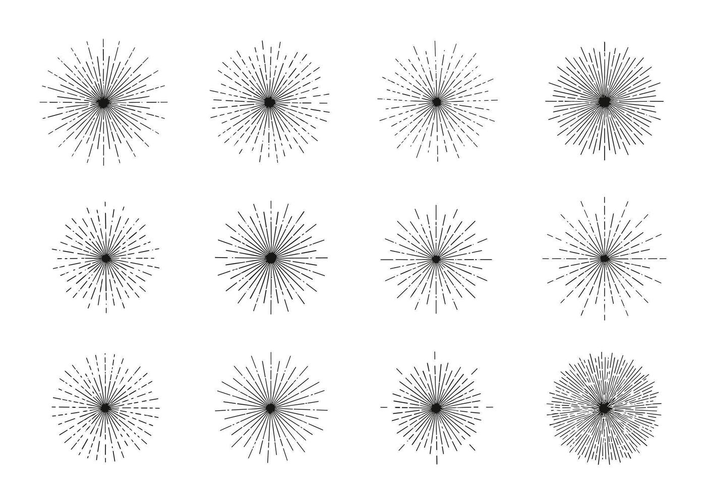 A collection of twelve abstract radiating starburst patterns with dark speckles and lines on a white background. Pro Vector
