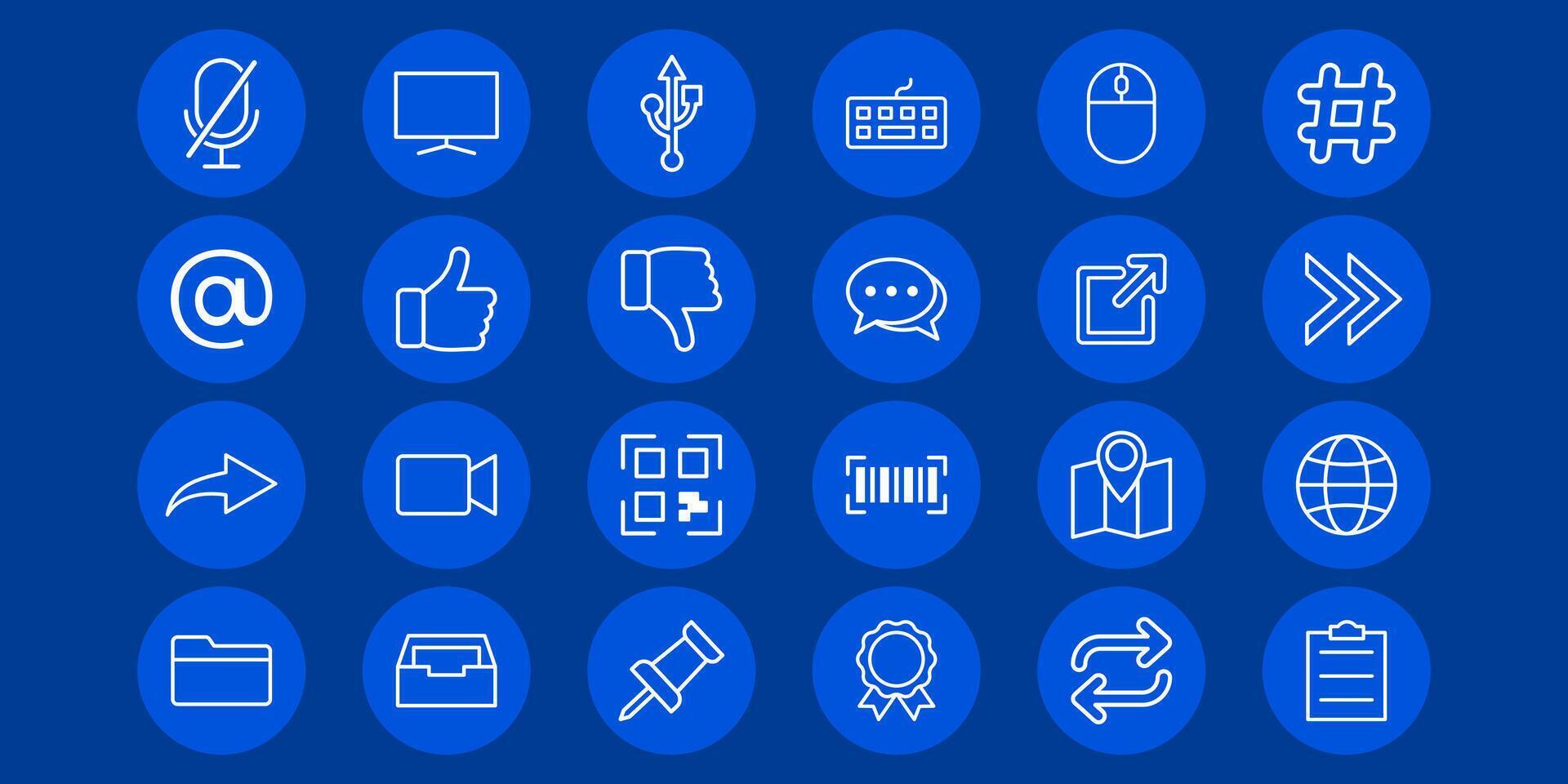 Modern blue round line icon pack with communication and tech symbols like mic, USB, email, chat, , map, and more. Perfect for app, web, social media, and digital design. Clean and minimal. Pro Vector