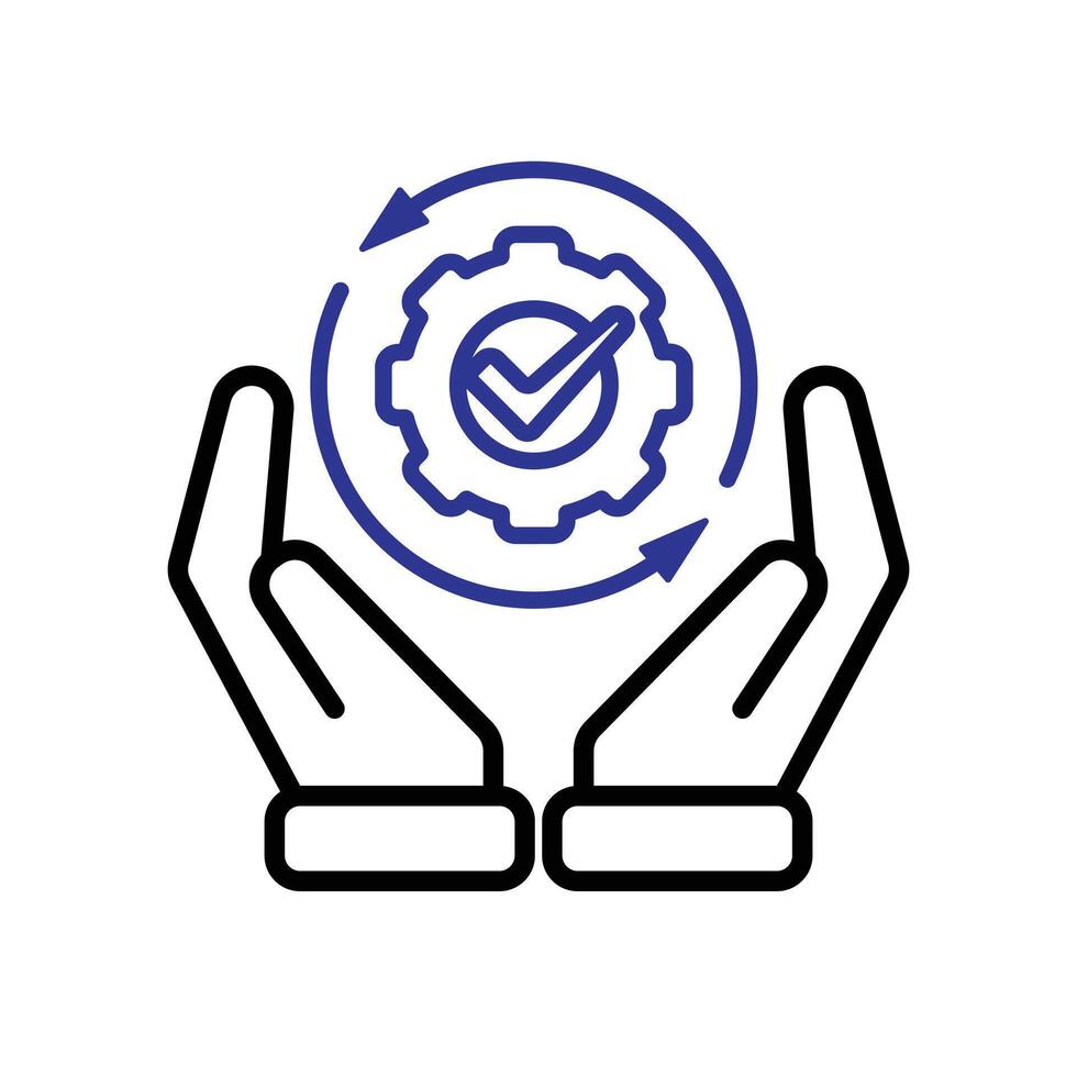 Automation icon. AI. Gear with a check mark and two circular arrows in two hand. automatic, manager, web. Outline design style. Pro Vector