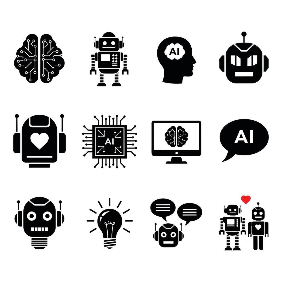 AI and Robot Icons Set Symbolizing Artificial Intelligence, Brains, Technology, and Robotics for Innovation and Future Concepts Pro Vector