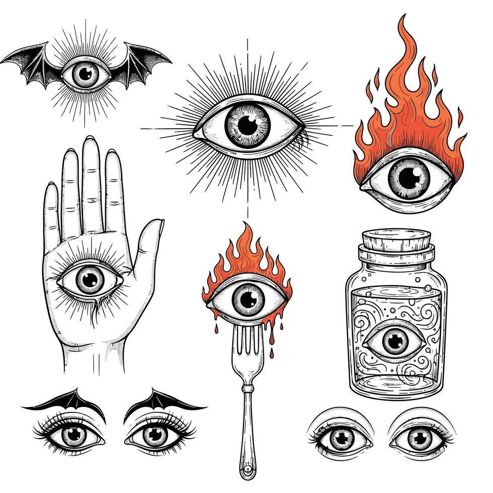 Mystical eyes and occult symbols, a collection of hand-drawn esoteric illustrations featuring eyes in various forms Pro Vector